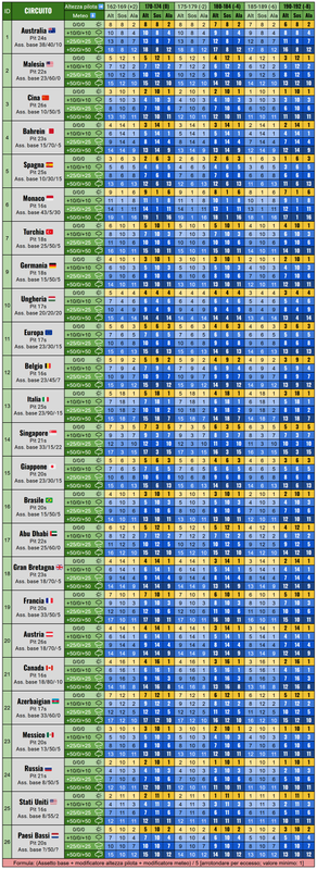 Sul sito non è possibile inserire le coordinate geografiche delle varie piste, ma solo dei nomi di città, pertanto potrebbero apparire delle differenze rispetto al meteo mostrato in iGP. I link qui sotto sono quelli delle località più vicine alle piste che io sia riuscito a trovare, e che ho riportato in parentesi quadre [...].